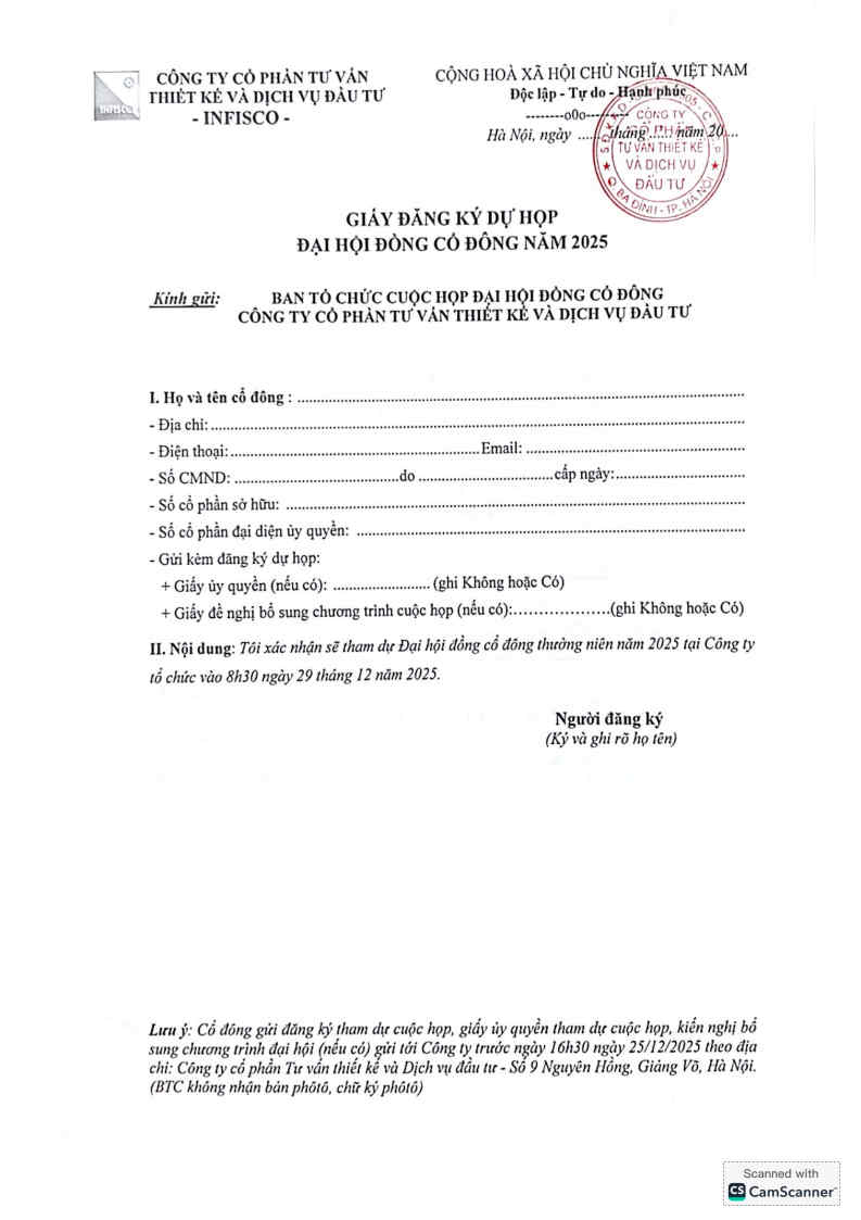 Trang chủ Thông báo họp cổ đông năm 2025 Giấy đăng ký dự họp Ngày đăng: 15/12/2025 Giấy đăng ký dự họp Bài viết liên quan Giấy ủy quyền dự họp (15/12/2025) Biên bản họp nhóm cổ đông 2025 (15/12/2025) Kiến nghị bổ sung chương trình đại hội 2025 (15/12/2025) Chương trình họp cổ đông thường niên 2025 (15/12/2025) Thư mời họp đại hội đồng cổ đông năm 2025 (10/12/2025) Đối tác