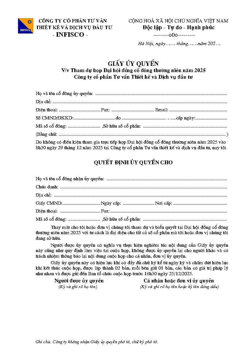 Trang chủ Thông báo họp cổ đông năm 2025 Giấy ủy quyền dự họp Ngày đăng: 15/12/2025 Giấy ủy quyền dự họp Bài viết liên quan Biên bản họp nhóm cổ đông 2025 (15/12/2025) Kiến nghị bổ sung chương trình đại hội 2025 (15/12/2025) Giấy đăng ký dự họp (15/12/2025) Chương trình họp cổ đông thường niên 2025 (15/12/2025) Thư mời họp đại hội đồng cổ đông năm 2025 (10/12/2025) Đối tác